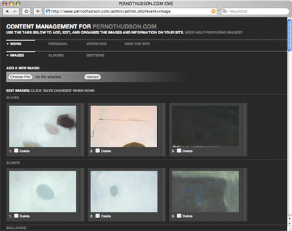 A companion content management site was developed to provide the artist with a means for swift content updates. Through a drag and drop interface, new work can easily be added and arranged.