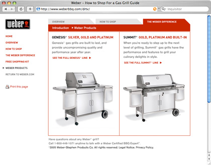 This gas grill buyer's guide site was created for Weber to compliment their 2004-2005 TV campaign. The site aims to educate consumers about what to look for in a great gas grill.